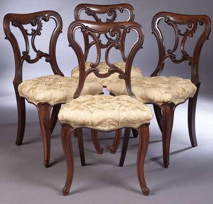 bearing label of J. Kendell & Co and workman's name Illingworth, each with waisted moulded open back containing asymmetric C-scrolls, buttoned stuffover serpentine seat on moulded cabriole legs with scroll toes (4)