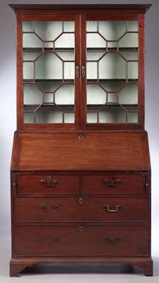 the top with dentilled cornice above astragal glazed doors enclosing shelves, the bureau with fall front enclosing fitted interior above two short and two long drawers on shaped bracket feet