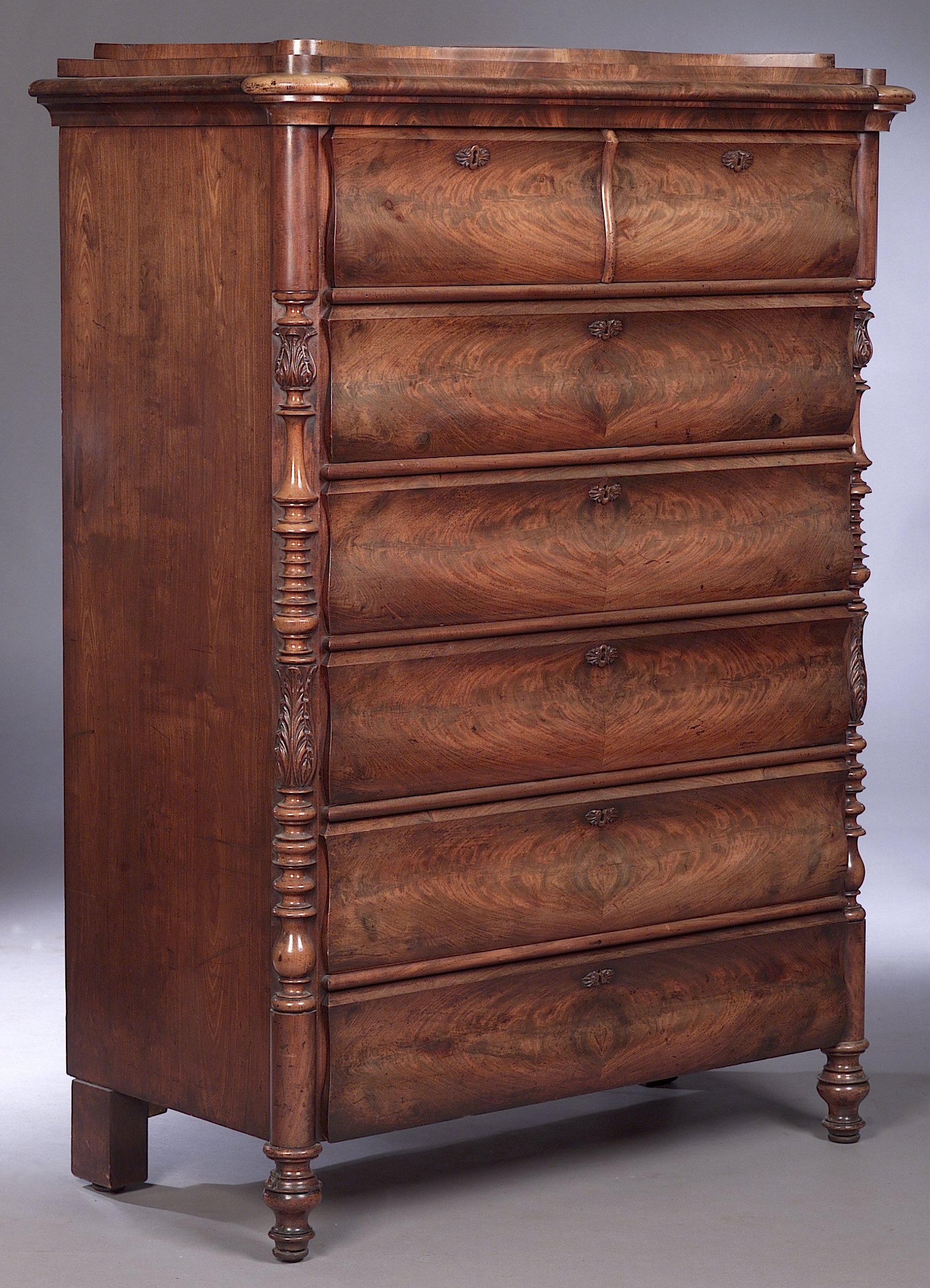 of rectangular form, the top with shaped steps and lobed corners above two short and five long ogee drawers flanked by turned and carved half engaged columns, on turned feet