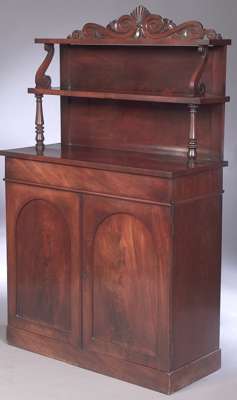 the rectangular top with two tiers of open shelves between turned supports and scrolled consoles, with carved scrolling ledged back above frieze drawers and two arched panelled doors, on plinth base