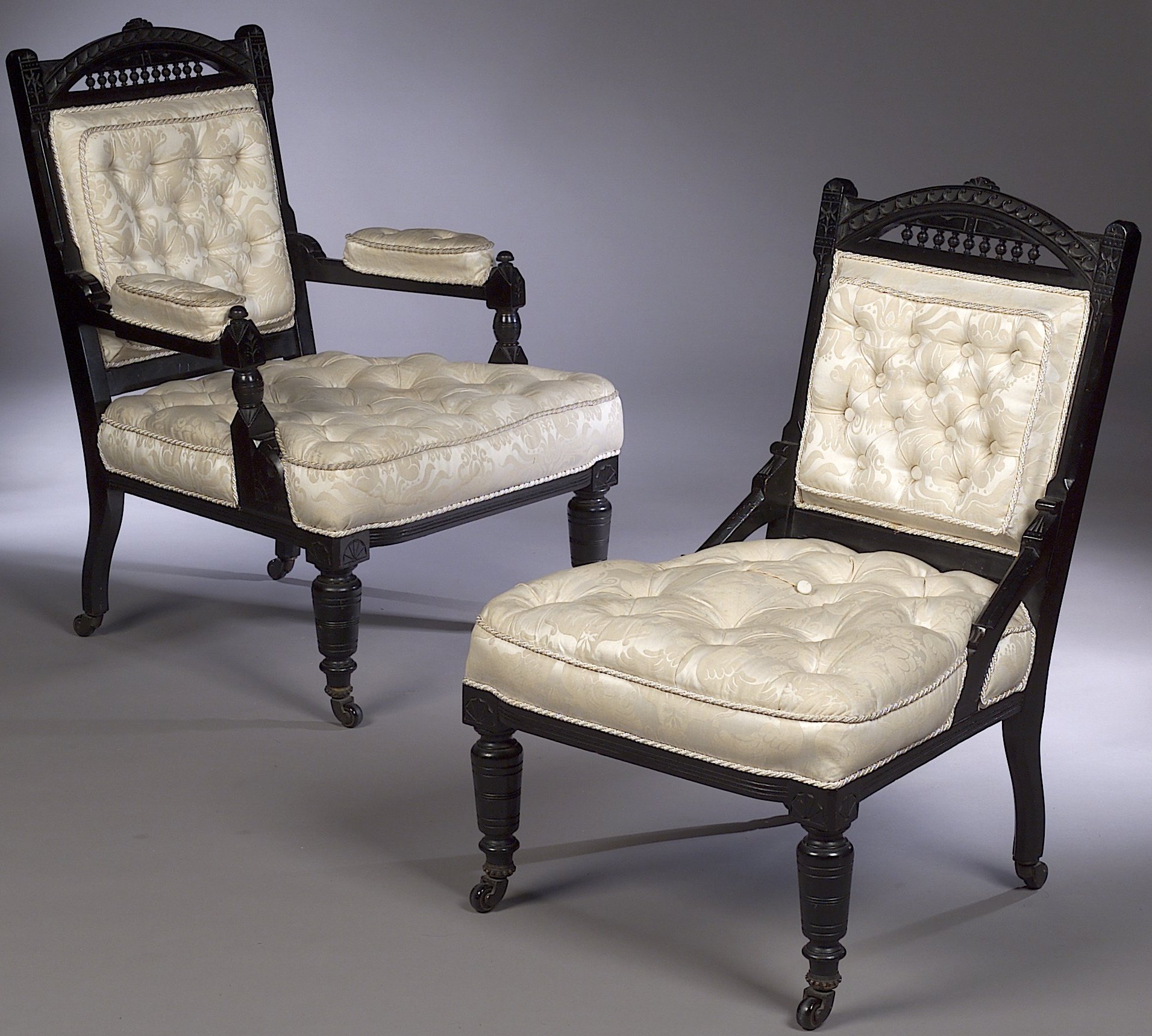 each with incised decoration, the balustraded arched back above buttoned panel, open arms with pads, and stuffover buttoned seat, ring turned legs with castors (2)
