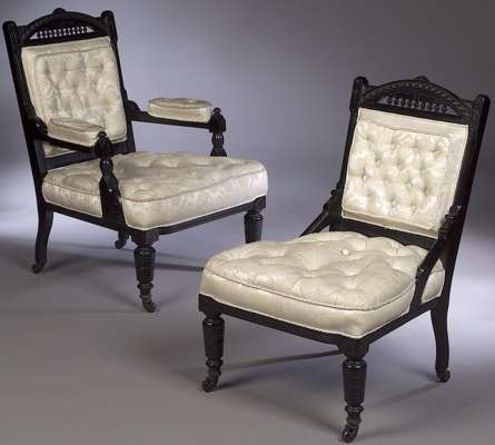 A late Victorian Aesthetic movement ebonised armchair and side chair