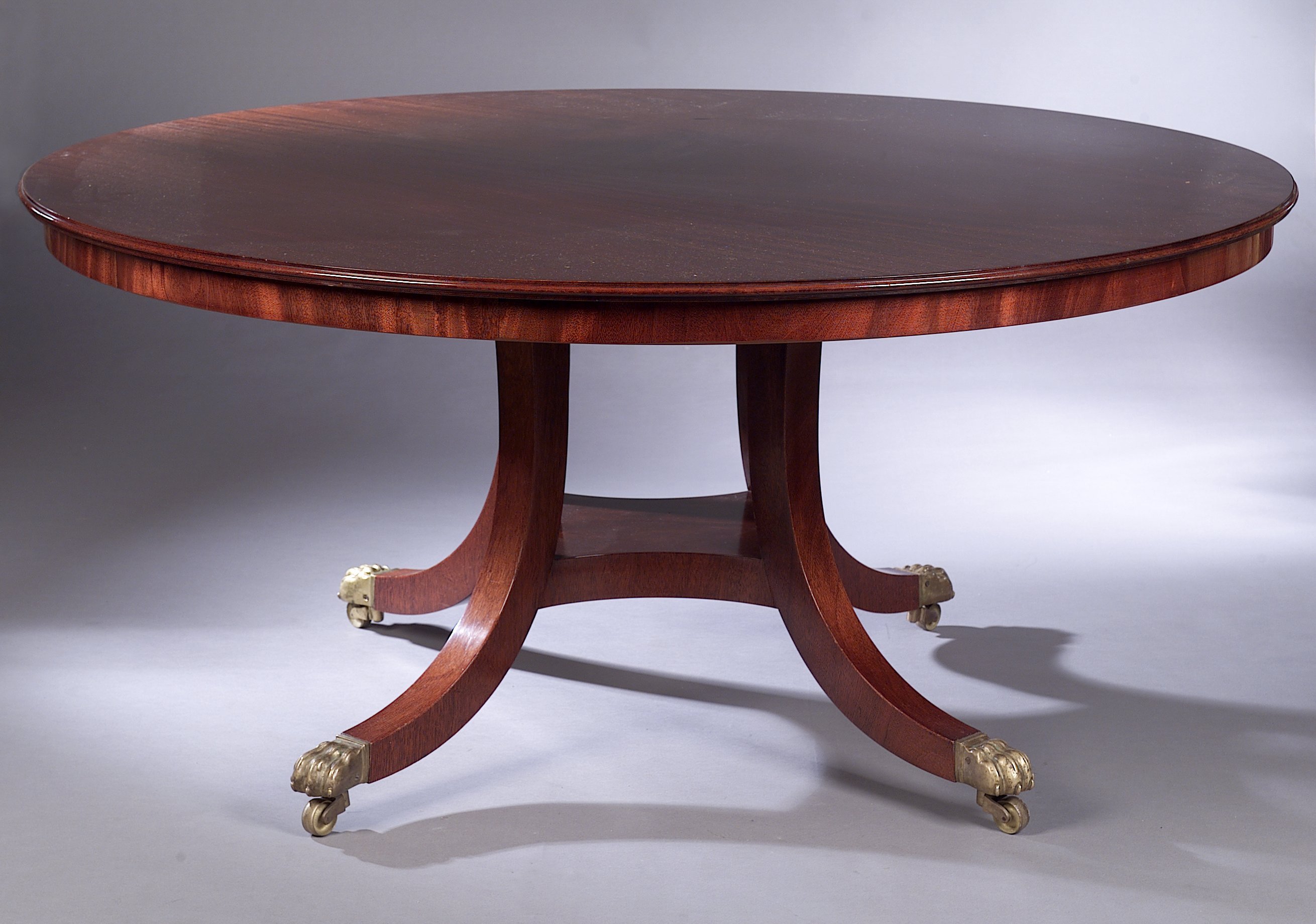 with astragal edge and shallow frieze, raised on four square section sabre supports with cast brass paw caps and castors and joined by concave platform, extending with set of concentric leaves