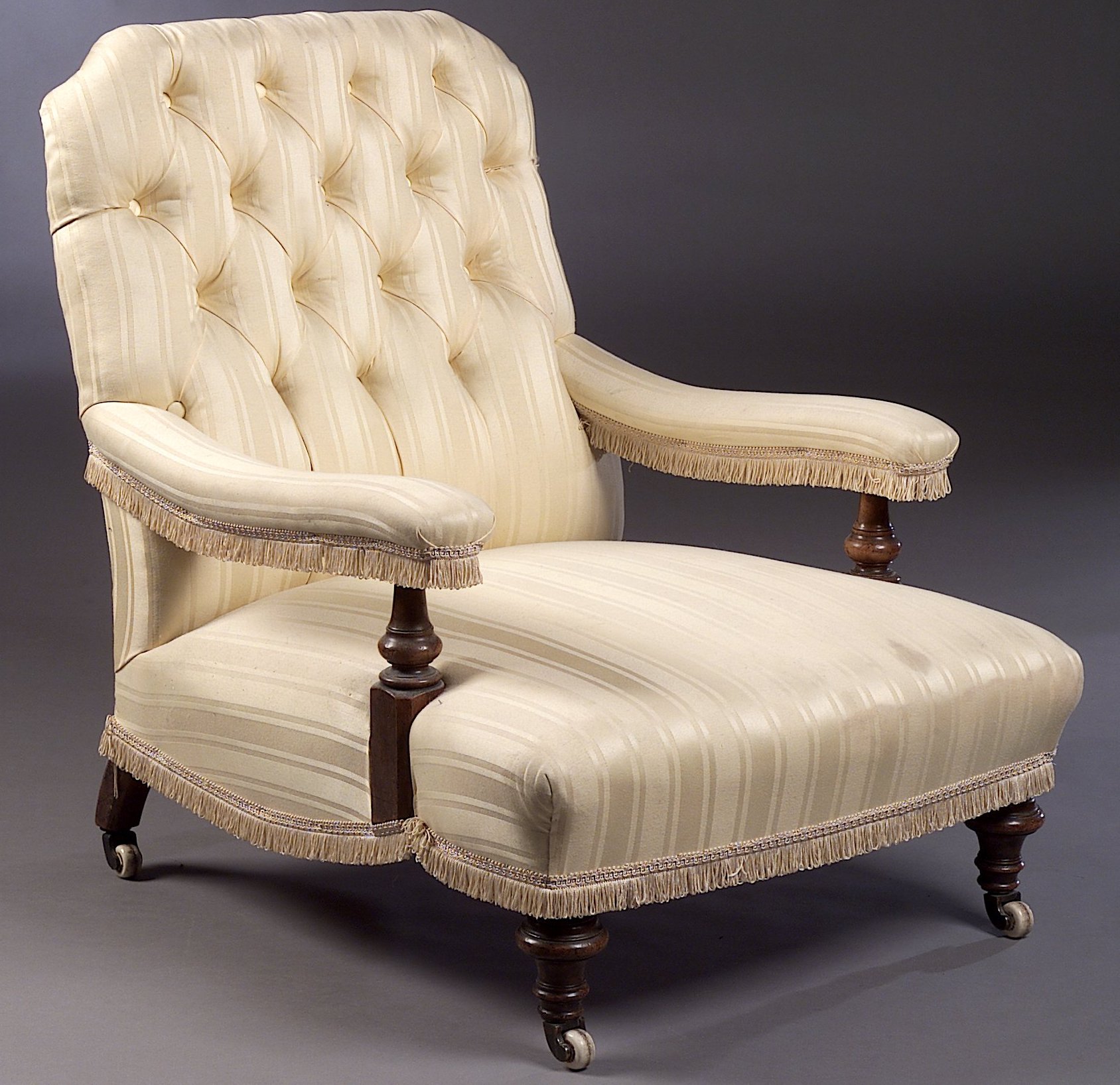 the buttoned back and upholstered arms on turned rests above stuffover seat on turned front feet, in modern self stripe cream upholstery