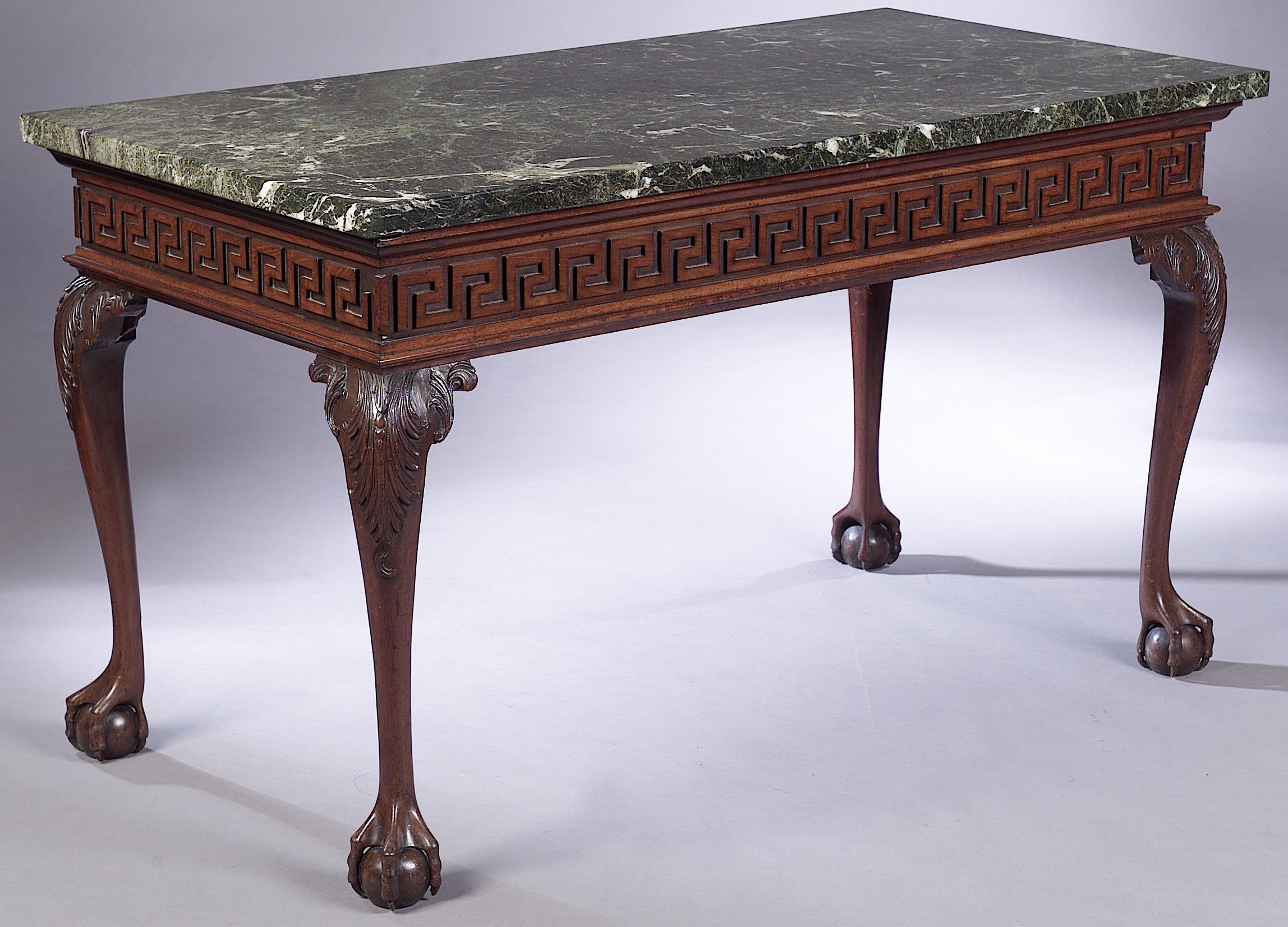 the rectangular verde antico marble top raised on base with Greek key frieze and cabriole legs with acanthus carving and ball and claw feet