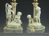 moulded as exotic gilt decorated fluted columns flanked by cherubs on vine cast plinth on circular gilt and turquoise laurel decorated plinth with three scroll feet (2)