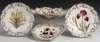of rococo design, the gilt and blue scroll border with moulded relief decoration, around central painted botanical specimen, painted pattern number 723 and some with impressed crown, comprising twenty one circular plates, two oval plates, two rectangular plates, three heart shaped plates and a tall oval tazza (29)