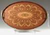 centred by marquetry fan medallion and ribbon tied swags, with waved gallery and cast brass scrolling handles
