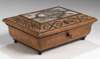 the rectangular caddy lid inset with an oval mother of pearl panel decorated with incised penwork and depicting a fishing boat at sea enclosed by mother of pearl spandrels further decorated with musical, military, garden and architectural trophies within a band of scrolling applied steel studs, opening to reveal an interior fitted with lift-out tray of sewing equipment, the ogee moulded sides raised on sphere feet