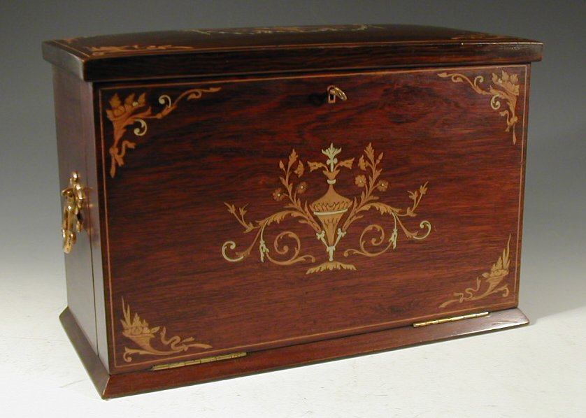 the satinwood and bone inlaid panels and brass carrying handle opening to reveal an extensively fitted interior including a fall front writing slope, pen tray and ink well
