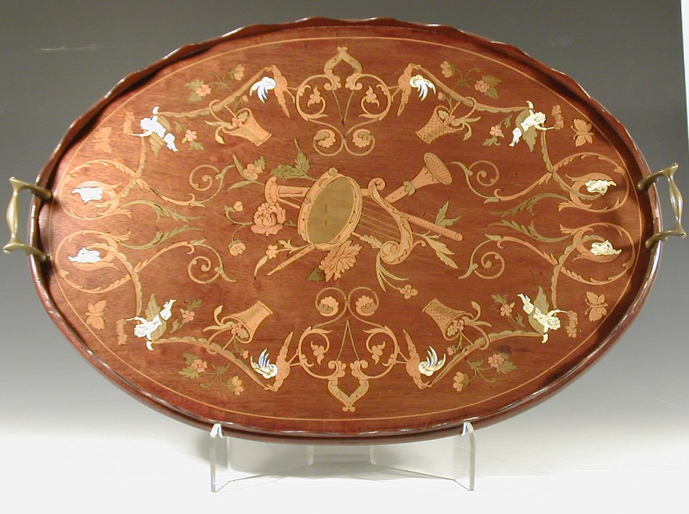 the wavy gallery enclosing an oval with satinwood, stained wood and ivory depicting bold acanthus scrolls, putto all centering on a trophy of musical instruments, brass side handles