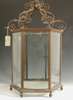 of hexagonal form with bevelled glass sides, with scrolling lobed cresting, suspended from a chain