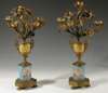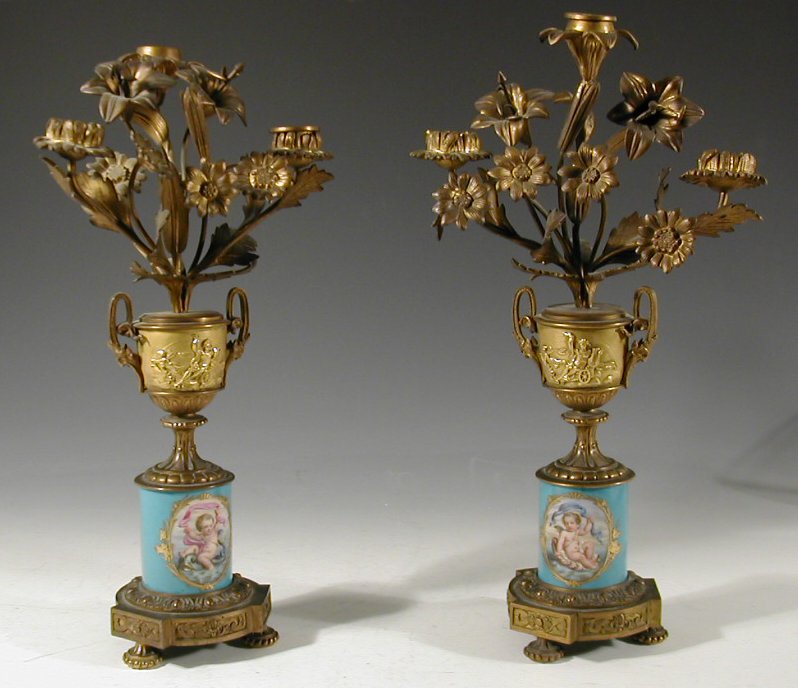 each formed as a bunch of flowers incorporating three sconces, issuing from a twin handled urn with gilt frieze of a god on their chariots, raised on Sevres style porcelain drum with plinth and three cast feet