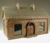 the pitched roof with attached chimneys and castellated guttering above rusticated walls, opening front door and two windows, with removable panels to the sides
