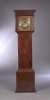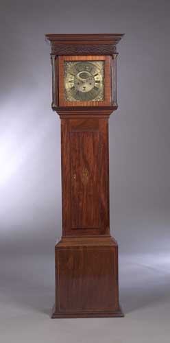 the twin train movement with anchor escarpment and false plate, B. WRIGHT 7 CO., striking on a bell and a square brass dial with Roman chapters, cast spandrels and date aperture, within hood with dentilled cornice and blind fret frieze, flanked by fluted columns above trunk door inlaid with Prince of Wales feathers and plinth base