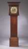 the twin train movement with anchor escapement striking on a bell, brass dial with cast spandrels and silvered chapter ring, subsidiary seconds dial and date aperture, the hood with moulded cornice and flanking columns, shaped trunk door and moulded plinth to base