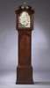 the twin train movement with anchor escapement striking on a bell, engraved arched silvered dial with Roman chapters and subsidiary seconds and date dials, strike/silent switch, the hood with swan neck pediment and brass finials, flanking columns, ogee arched trunk door, plinth base