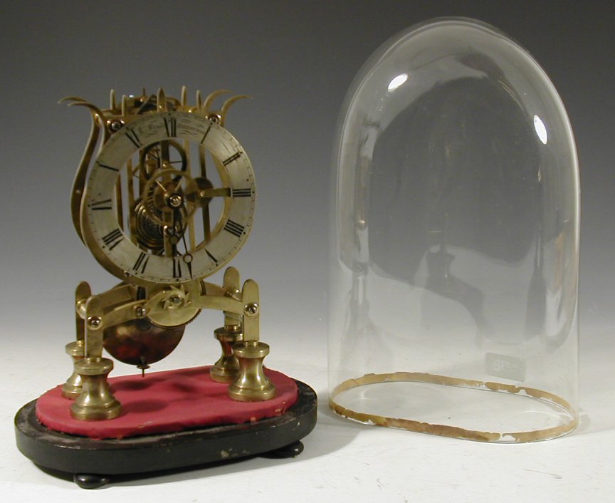 the single train fusee movement with circular silvered dial inscribed with Roman chapters, the whole raised on an ebonised plinth and standing under an arched glass dome
