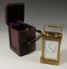 the twin train repeating movement with lever platform escapement, the enamelled dial with Roman chapters contained within brass case with carrying handle (comes with leather carrying case)