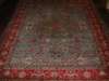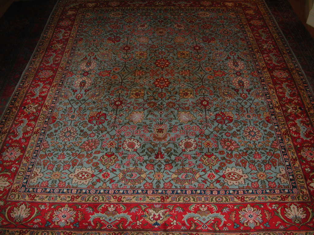 the light blue field with allover scrolling palmette and flowerhead design, within crimson palmette border, between ochre and indigo stripes