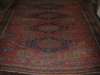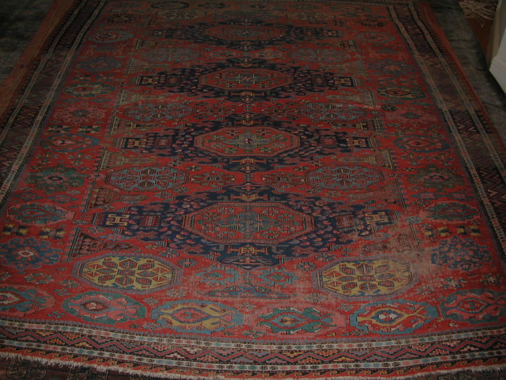 the red field with four elongated indigo and red medallions, surrounded by smaller polychrome medallions, within brown zig-zag border between ivory stripes