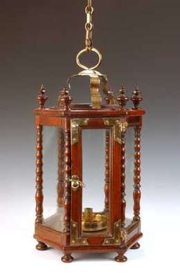 the hexagonal case with bobbin turned frame, urn finials and bun feet fitted with brass liner to base with tray and sconce, open to the top with scrolling brass cresting and chain