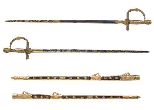 the sword mounted in ormolu, the grip probably in gold, a straight-bladed sword of spadroon type in an ormolu-mounted scabbard with dark blue velvet panels; the pommel is formed as a bearded and crowned head, probably intended to represent Neptune or Poseidon; the knucklebow is formed of a cable and blocks and incorporates an oval decorated with the sword and mace of the City, in Saltire; the straight quillon is formed as a fasces, the stepped langets decorated with mythical sea creatures and terminating in acanthus leaf and pineapple finials; the polished grip bears, in relief, the Arms of the City of London and those of Sir David Milne, and having pendant from them the badges of the KCB and the Dutch Royal Military Order of William; above and below the Arms are naval trophies and crowns; the grip ferrules are formed of oak-leaves and acorns; the straight, 31" (79cm) blade is blued and gilded for its entire length, the decoration incorporating the Arms of the City, female figures allegorical of Fame and of the City, trophies of arms and the presentation inscription WOOD, MAYOR. A COMMON COUNCIL HOLDEN IN THE CHAMBER OF THE GUILDHALL OF THE CITY OF LONDON ON THURSDAY THE 26TH DAY OF SEPR.1816. RESOLVED UNANIMOUSLY, THAT THE FREEDOM OF THIS CITY WITH A SWORD OF THE VALUE OF ONE HUNDRED GUINEAS BE PRESENTED TO REAR ADMIRAL SIR DAVID MILNE, KNIGHT COMMANDER OF THE MOST HONOURABLE ORDER OF THE BATH, IN TESTIMONY OF THE ESTEEM & GRATITUDE OF THIS COURT FOR THE ZEAL BRAVERY & TALENT DISPLAY'D BY HIM IN THE VICTORIOUS ATTACK UPON ALGIERS BY THE FLEET UNDER THE COMMD. OF ADML. LORD VISCT. EXMOUTH, ON THE 27TH OF AUGUST LAST. WOODTHORPE;