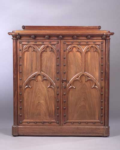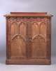 the moulded cornice above a pair of panelled doors with applied lancet tracery and rosettes enclosing a shelved interior on a plinth
