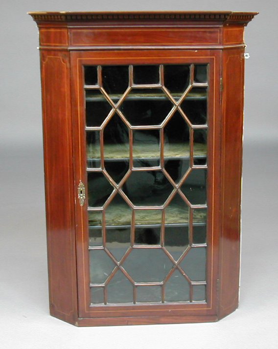 with boxwood stringing, the dentilled cornice above astragal glazed door enclosing velvet fitted shelves