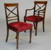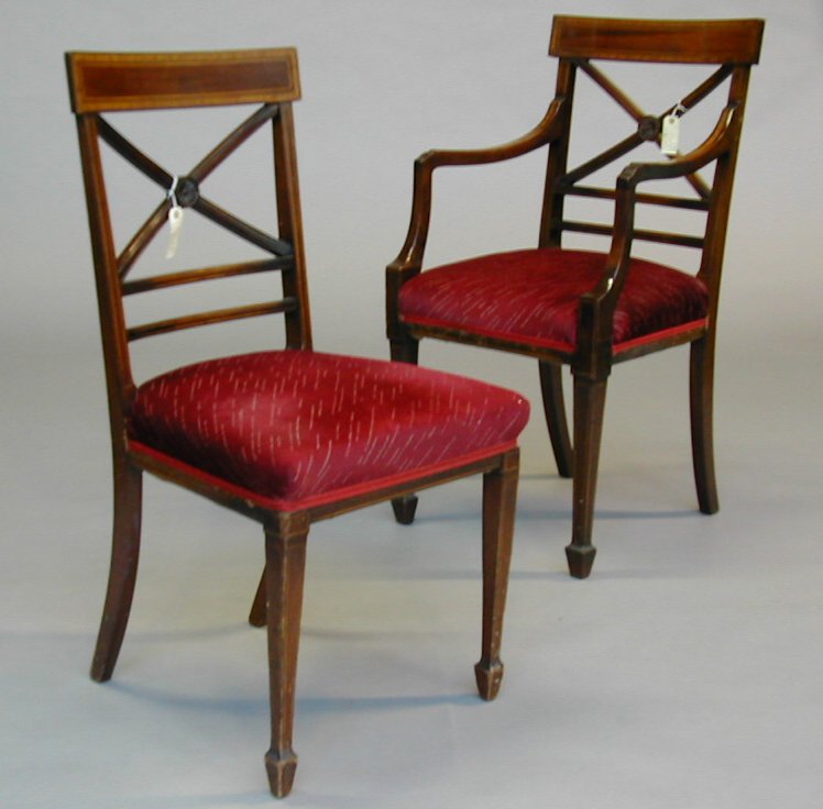 with satinwood banding and boxwood stringing, each with bar back above X splat centred by roundel, stuffover seat and square section tapered legs with spade feet, including two carvers (6)