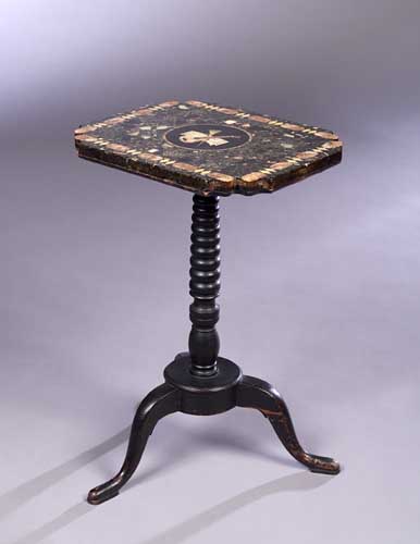 the rectangular scagliola top with marble inlay and central inlaid panel of musical trophies, the ebonised base with bobbin-turned column and three cabriole legs