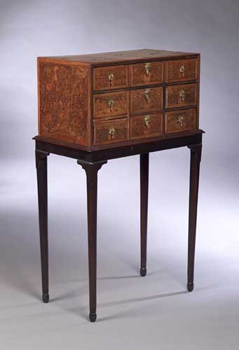 of rectangular form, the top with a central panel of inlaid flower heads enclosed by compartmental border, the front comprising one long drawer above a central deep drawer enclosed by four further drawers, each with applied mouldings and inlaid with nine marquetry panels of baskets issuing fruit, the side panels profusely inlaid with fruit and flowers issuing four urns, the associated mahogany stand with slender turned legs with lappet brackets