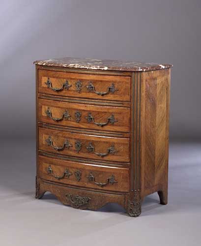 the marble top with moulded edge above four long drawers divided and flanked by brass lined flutes, shaped apron with gilt brass mounts
