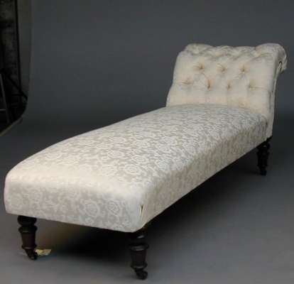 with buttoned scroll end above stuff-over seat raised on turned tapering mahogany legs on brass castors