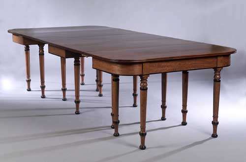 with D ends and central drop leaf section, reeded edge and plain frieze with ebony banding, ebonised ring turned legs with toupie feet