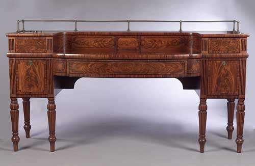 with ebony stringing, the stage back with projecting flanks and corresponding brass rail above bow front with long frieze drawer flanked by deeper drawers on reeded and ring turned tapering legs with toupie feet