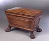 of rectangular sarcophagus form, the hinged pyramidal lid enclosing lead lined interior above panelled body raised on carved paw feet on castors, brass drainage tap to rear