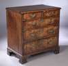 with boxwood stringing, the rectangular top with geometric inlaid panels and moulded edge above two short and three long graduated drawers on later shaped bracket feet