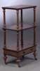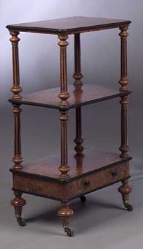 the rectangular shelves with moulded edge and rounded edge and rounded angles raised on turned and fluted supports, the base with single drawer on turned feet with brass caps and castors