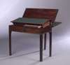 the rectangular double foldover top with fluted edge opening to reveal surface for cards and a drawing slope with two drawers below and fold down pen tray above, the whole raised on square chamfered legs