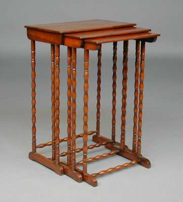 each with rectangular top and bobbin turned legs joined by stretchers, sled base