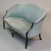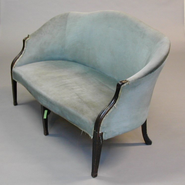 the upholstered hump back and downswept arms with moulded uprights enclosing a serpentine upholstered seat, raised on square section tapering front legs, each with incised decoration and terminating in block feet