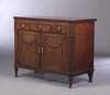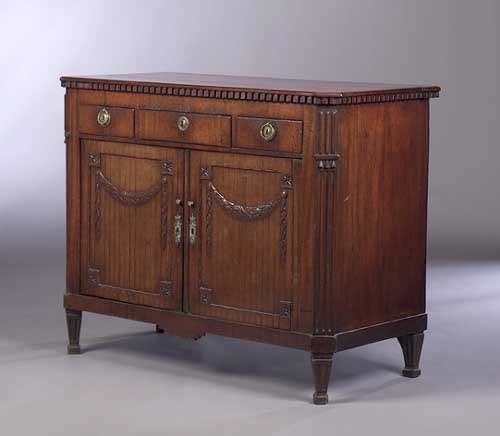 the shaped rectangular top with canted angles above dentilled cornice and three frieze drawers, pair of panelled tambour doors below carved with laurel swags enclosing shelved interior, flanked by fluted pilasters, on fluted spade feet