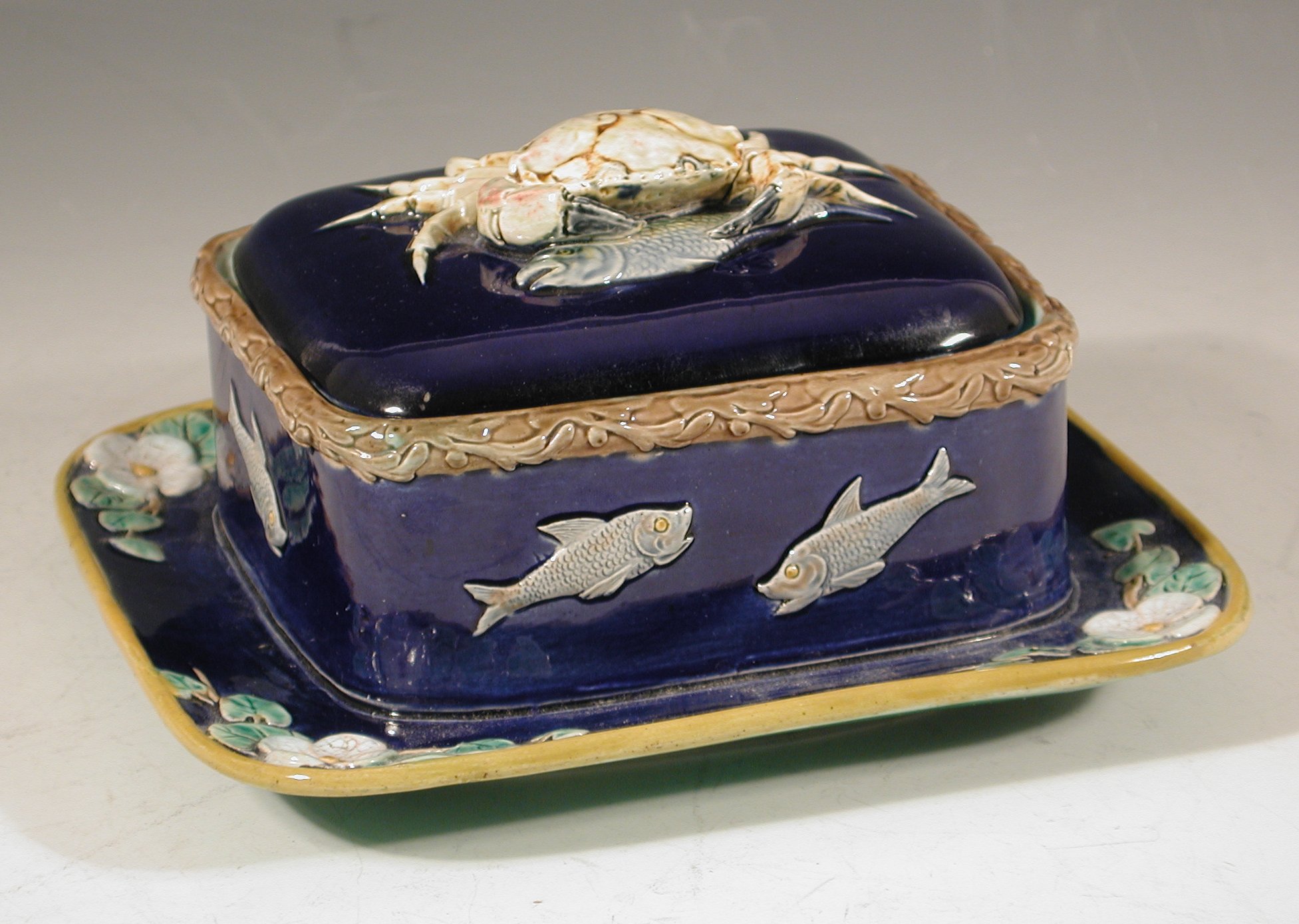 the rounded rectangular lid with relief moulded crab and fish decoration, the deep blue ground relief moulded to the sides with fish, and to the tray base with lilies