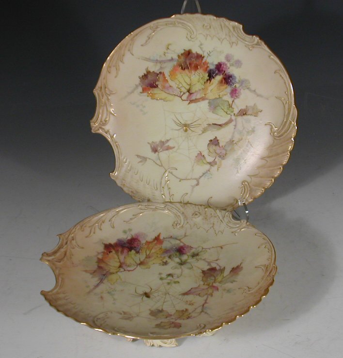 the blush ivory ground painted with a gilt spider weaving a web, on a late summer bramble branch, with moulded scalloped border, puce printed mark and printed number 1427, with registered number 142784, painted number 3957 comprising; twelve circular plated, one tall tazza and four low comports
