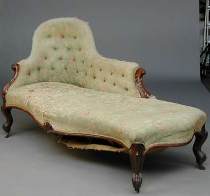 the arched buttoned three quarter back on serpentine stuffover seat with leaf carved scrolling terminals and cabriole legs with castors