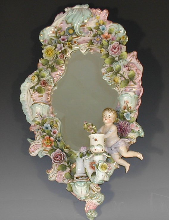 of Rococo design, the serpentine scalloped border with flower encrusted decoration and three candle sconces (only one branch for each) and applied cherub with pale purple sash and holding a garland of roses