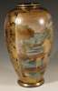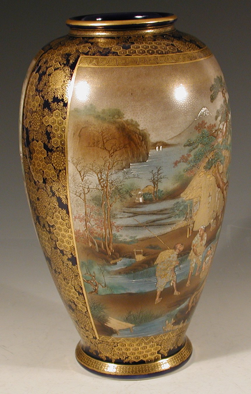 the deep blue ground with gilt chrysanthemum and brocade decoration, with two large opposed painted panels, one depicting fishermen with snow capped mountain in the distance, the other depicting conversing figures before a garden with pavilion, signed on base