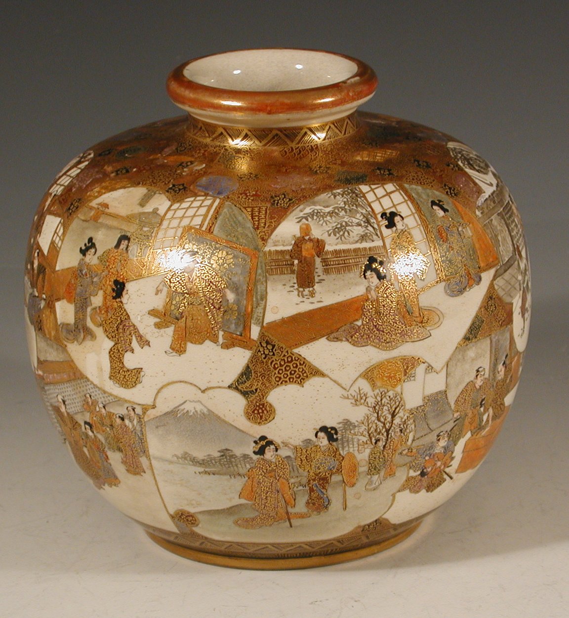 Meiji period, the squat bulbous body delicately painted with interlocking shaped panels of figures, including two ladies by a lake with Mount Fuji in the background, the neck with shaped brocade frieze, gilt rubbed mark to base