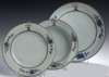 each piece painted with motto 'PRO.PATRIA' in a gilt banner, above a figure of a warrior wearing wide pantaloons, holding a sword in his right hand and wearing a plumed hat, with loose peony sprays in blue enamel, the sides with continuous rouge de fer barbed frieze, comprising: one large deep bowl and one similar, smaller; three large platters; four large shallow bowls and four similar smaller; thirteen meat plates; and sixteen soup plates (42)